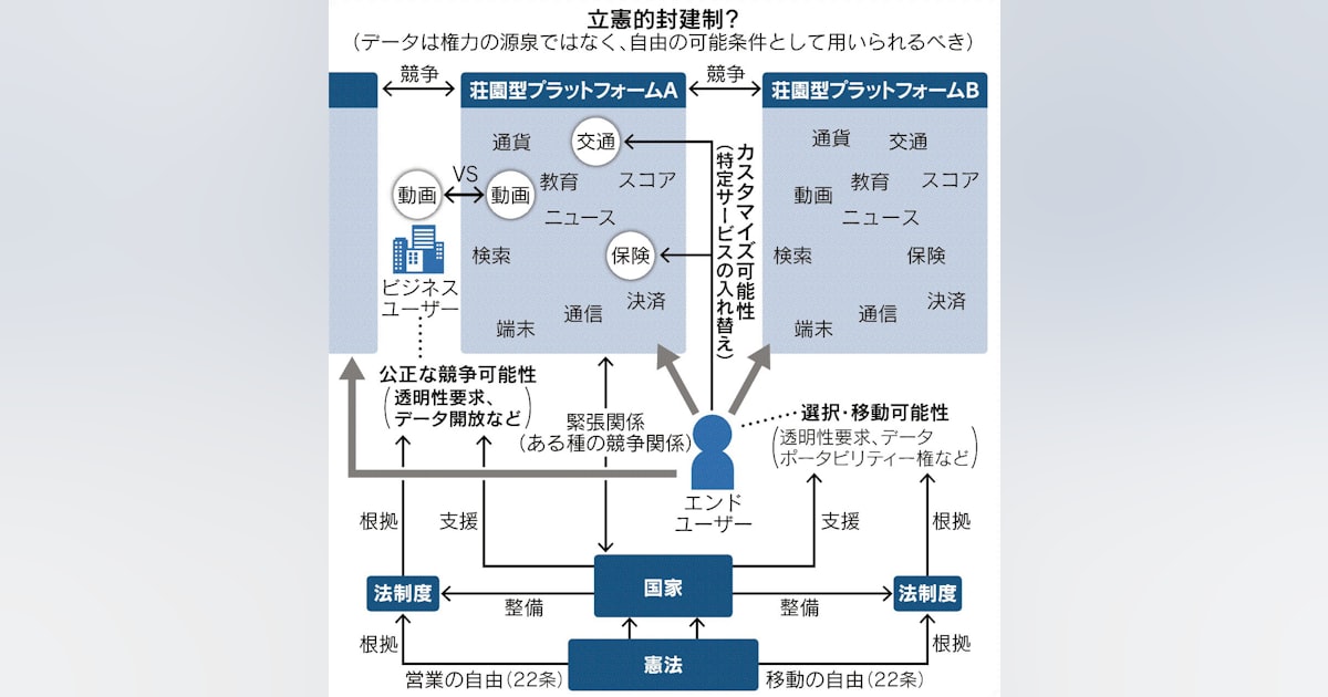 プラットフォーマーは検索システムなどのように生活インフラを押さえていることから、ユーザーにとってはデータ利用などの「抱き合わせ」を迫られると同意せざるを得ず、自己決定の幅を狭める可能性があります。いかに特定のプラットフォーマーに囲い込まれず、ユーザーがプラットフォーマー間を円滑に行き来できる仕組みを構築するかが問われます。この種の問題の解決こそ、国家による法整備の出番ではないか。いわばプラットフォーマーに対する「立憲主義」の提唱です。